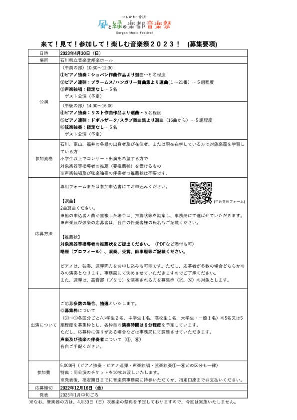 2023年4月30日(日)、石川県立音楽堂邦楽ホールのステージに立ってみませんか? 石川、富山、福井の各県の出身者及び在住者、または現在在学している方でピアノ、声楽、弦楽器を学習している方で、コンサートに出演していただける方を募集いたします!